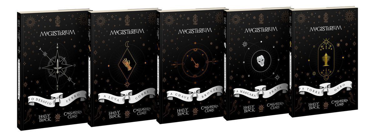 Holly Black e Cassandra Clare, duas das maiores autoras de fantasia da atualidade, trazem uma incrível nova série que desafia tudo o que você conhece sobre o mundo da magia. Os 5 livros de Magisterium pela primeira vez reunidos em uma caixa rígida e com novas capas, feitas exclusivamente para o box. Duas das maiores autoras young adults do mundo escrevendo juntas sobre um mundo repleto de magia, aventuras e reviravoltas chocantes. Cassandra Clare, cujos livros dos Caçadores de Sombras já venderam mais de 60 milhões exemplares no mundo inteiro, e Holly Black, renomada autora da série best-seller O Povo do Ar, trazem vida ao Magisterium, uma escola de magia diferente de tudo que você já achou saber o universo da fantasia. A série acompanha a história de Callum Hunt e seus anos passados dentro do Magisterium, um lugar que sempre foi ensinado a temer e a odiar. Enquanto aprende mais sobre os seus poderes, Call precisa colocar à prova todo o seu conhecimento para sobreviver. Criado em colaboração pelas fantásticas mentes de Cassandra Clare e Holly Black, as autoras oferecem a você as chaves das portas do Magisterium, um universo mágico e inexplorado. Vistam as suas capas de magos, tomem cuidado para não serem Dominados pelo Caos e boa sorte! O Magisterium lhes oferece as boas-vindas. Reunindo pela primeira vez os cinco livros da série, o Box Magisterium contém O desafio de ferro, A luva de cobre, A chave de bronze, A máscara de prata e A torre de ouro em edições ilustradas e com capas inéditas. “Ambientado em um Estados Unidos em que a magia existe, a série Magisterium combina os talentos de Black e Clare em uma empolgante história de amadurecimento que reúne os conhecidos elementos da fantasia enquanto deixa os leitores sem saber o que vai acontecer em seguida.” — Publisher’s Weekly