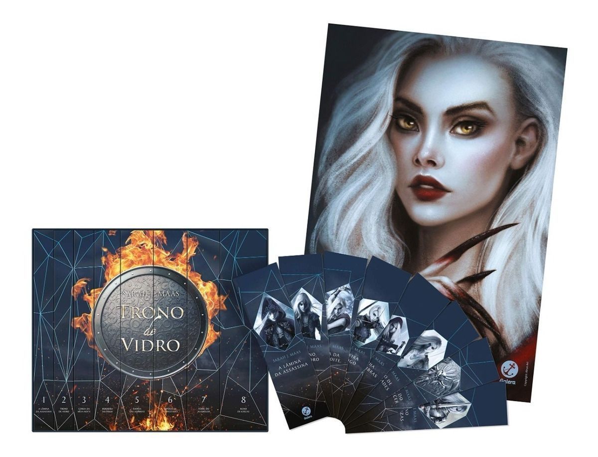 O Box Trono de Vidro traz, pela primeira vez, a série fenômeno mundial em um exuberante box rígido e livros com novo projeto gráfico. Inclui marcadores temáticos e pôster da personagem Manon Blackbeak Trono de Vidro conta a saga de Celaena Sardothien, assassina nascida em uma terra sem magia, onde o rei governa com mão de ferro. Depois de cumprir um ano de trabalho escravo nas minas de sal de Endovier por seus crimes, ela é arrastada diante do príncipe herdeiro. O príncipe Dorian oferece à Celaena sua liberdade, mas sob uma condição: ela deve ganhar uma competição para se tornar a nova assassina real. Seus oponentes são ladrões, assassinos e guerreiros de todo o império, cada um patrocinado por um membro do conselho do rei. Se ela derrotar seus concorrentes em uma série de eliminações, servirá ao reino por três anos como assassina e depois terá sua liberdade. A jovem aceita prontamente o desafio e começa as sessões de treinamento com o capitão da guarda, Westfall. Treinar é desafiador e emocionante, mas a vida na corte é um tédio sem fim. No entanto, as coisas ficam mais interessantes quando o príncipe Dorian começa a mostrar sentimentos por ela. Quando um a um, outros competidores aparecem mortos em circunstâncias obscuras, fica claro que algo bastante maligno mora no castelo de vidro - e está lá para matar. Celaena decide investigar antes que ela se torne a próxima vítima, e essa busca a leva a descobrir um destino muito maior do que ela poderia imaginar. “Uma leitura fantástica.” ? Publishers Weekly “Fãs de fantasia épica vão mergulhar nessa série e nunca mais vão querer sair. ”? Resenha estrelada no Kirkus Reviews para Coroa da Meia-Noite “Uma leitura fantástica de proporções épicas.” ? USA Today sobre Coroa da Meia-Noite “Com assassinatos, traições, amor e magia, este romance tem algo para corresponder aos interesses de todos.” ? RT Book Reviews sobre Coroa da Meia-Noite “Impossível parar de ler.” ? Kirkus Reviews sobre Rainha das sombras