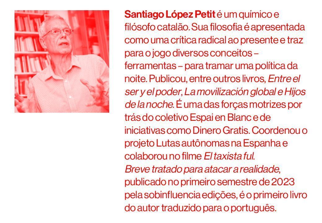 Este livro, como uma navalha, recorta e ataca seu objeto: a realidade. Não qualquer realidade, mas a nossa, a realidade capitalista.Consumindo tudo, sem deixar nada de fora, a realidade do capital torna-se absoluta e se desenvolve pelas demandas de seu interior, demonstrando-se em seu bolor e desvelando seu funcionamento. A globalização neoliberal é fundamento e força motriz da própria realidade. Avançadas tecnologias e definições ainda capturadas pela luz do real rompem o discurso e demonstram a democracia enquanto articulação do estado de guerra e do fascismo dito "pós-moderno". Em seu desdobramento, em seu afastamento da tautologia, portanto, a realidade nos mostra suas fraquezas e seus membros carcomidos. "Breve tratado para atacar a realidade", de Santiago López Petit, é um pacto com a noite - a política noturna na qual a realidade é indigesta; política que perfura a realidade, trespassando-a, com o mistério de algo escuro, macerado onde a luz não alcança, abrindo a possibilidade de uma nova política, uma política da noite.