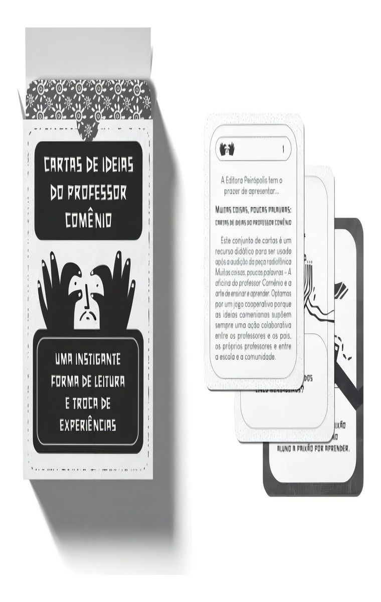 As Cartas de ideias do professor Comênio nasceram a partir da obra Muitas coisas, poucas palavras, uma peça radiofônica e livro cantante que apresenta aos leitores-ouvintes o encontro de Francisco Marques Vírgula Chico dos Bonecos e o professor Comênio, em um criativo diálogo sobre as ideias do educador europeu apresentadas em sua obra mais conhecida, a Didática Magna. Buscando trazer mais elementos para a reflexão, o autor juntou-se a Cyrce Andrade para criar esse interessante recurso didático (a ser usado após a audição da peça): um jogo de cartas cooperativo proposto a professores, famílias e comunidade escolar. Neste jogo, os participantes voltarão às principais ideias comenianas, reconhecendo os passos necessários para a tarefa de educar, mas também os percalços e as dificuldades que podem se apresentar no caminho. A proposta é colaborativa, sem que ao final se tenham perdedores ou vencedores: ao jogar, todos ganham ótimas oportunidades de refletir sobre a emocionante aventura de ensinar e de aprender.