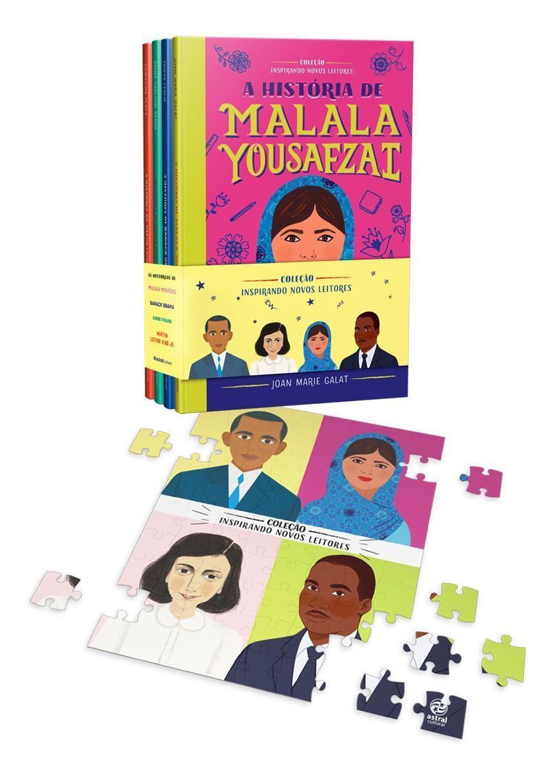 Anne Frank era uma jovem judia que viveu durante a Segunda Guerra Mundial, quando pessoas como ela foram perseguidas pelo simples fato de seguirem a religião judaica. Para tentar sobreviver, ela e sua família foram obrigadas a se refugiar em um esconderijo que ficava dentro do prédio em que o pai de Anne trabalhava. Enquanto os anos se passavam, a garota compartilhava medos, sentimentos e, principalmente, a esperança de um mundo melhor em seu diário, que acabou sendo editado e transformado em livro, lançado em mais de setenta idiomas. Com a força de suas palavras, Anne emocionou o mundo e virou um símbolo de coragem e resistência ao Holocausto e aos horrores praticados durante a guerra. Mesmo com o preconceito contra a cor de sua pele, Barack Obama cresceu sentindo-se livre para sonhar e ser o que quisesse. E seu grande sonho, desde menino, sempre foi ajudar as pessoas. Foi por isso que ele se tornou presidente dos Estados Unidos, o primeiro negro a assumir esse importante cargo. Mas, antes de fazer história lutando pelos direitos civis, ele foi uma criança inteligente e cheia de vontade de transformar o mundo em um lugar melhor. Descubra como Barack passou de um menino sonhador para um dos líderes mais prestigiados e respeitados que já existiu. Malala Yousafzai era apenas uma criança quando se tornou uma ativista corajosa. Antes de lutar bravamente pelo direito das meninas de poder estudar, ela era uma garota doce e atenciosa, que gostava de ir à escola, de brincar com os vizinhos e os irmãos e, como toda criança, de sonhar acordada. Aos dez anos, Malala, uma das melhores alunas de sua turma, foi impedida de estudar – ela e todas as meninas da região onde morava. Mas ela não deixou que isso a impedisse. Com a força de sua voz, provou que até mesmo uma criança pode ajudar a mudar o mundo. Descubra como Malala defendeu a igualdade de direitos e se tornou a pessoa mais jovem a receber o Prêmio Nobel da Paz. Desde muito jovem, Martin Luther King Jr. conviveu com o racismo, devido à cor de sua pele. Ele cresceu em uma época em que pessoas brancas e negras não podiam dividir os mesmos espaços públicos, principalmente no sul dos Estados Unidos. Assim, o menino inteligente que sonhava em ser bombeiro, médico e até artista transformou-se em um dos líderes mais importantes da história na busca pelos direitos dos negros, ao combater a segregação racial. Com discursos poderosos e protestos pacíficos, Martin desafiou o racismo e lutou por um mundo mais justo para todos.
