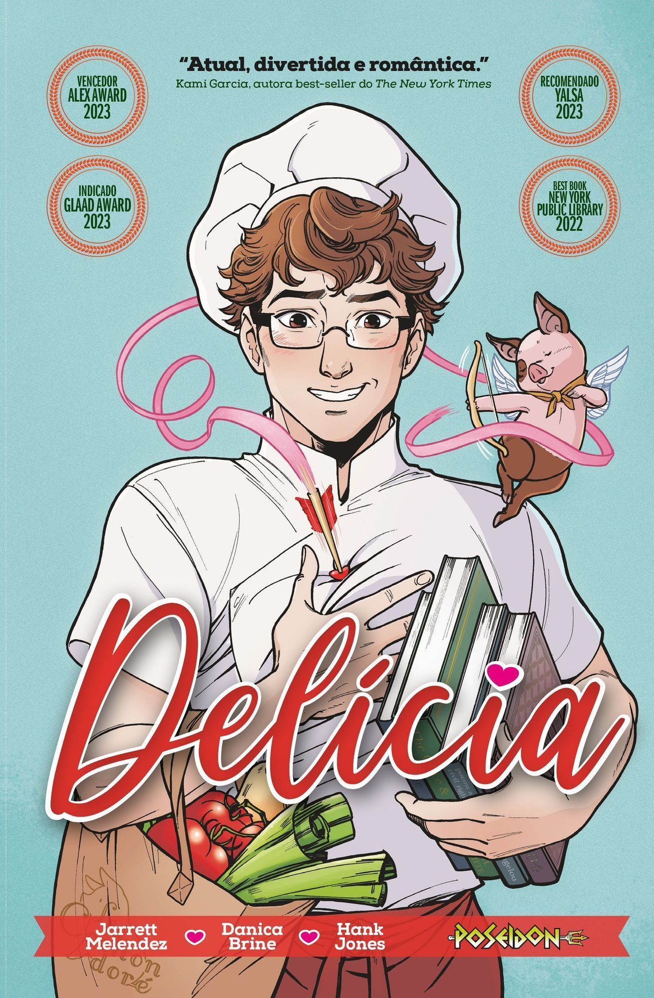 A faculdade acabou! Ben Cook acabou de se formar e está à procura de emprego, qualquer coisa relacionada à sua paixão por ler e escrever. Nas entrevistas de trabalho, ele sempre fica pra trás... pois “não tem experiência suficiente”. Mas quando se depara com uma placa “Contratando – Não é preciso experiência” do lado de fora de um restaurante, Ben aproveita a chance para conseguir o primeiro emprego. De fato, ele não é tão ruim na cozinha e, além disso, pode continuar procurando uma vaga em sua área nesse meio-tempo. Mas quando conhece Liam, um dos chefs adoráveis do restaurante, ele começa a se sentir dividido entre querer ficar e cozinhar ou seguir seu plano original de se tornar um escritor. “Atual, divertida e romântica. Esta história de amadurecimento sobre amizade, encontrar a si mesmo e seguir seus sonhos vai derreter seu coração e ensinar você a fazer uma torta de pera incrível!” – Kami Garcia, autora de Jovens Titãs: Ravena, Imaculadas e da série Beautiful Creatures “Tive o prazer de ver Delícia se desenvolver da criação até a execução. A paixão de Jarrett e Danica pelo projeto resplandece neste livro... O texto de Jarrett é doce, cativante e uma voz necessária nos quadrinhos. A arte de Danica é linda, vibrante, e está na cara o quanto ela se divertiu ao desenhar o livro. Melhor eu conseguir uma cópia autografada para poder me gabar disso.” – Katie Cook, criadora de Nothing Special no Webtoon