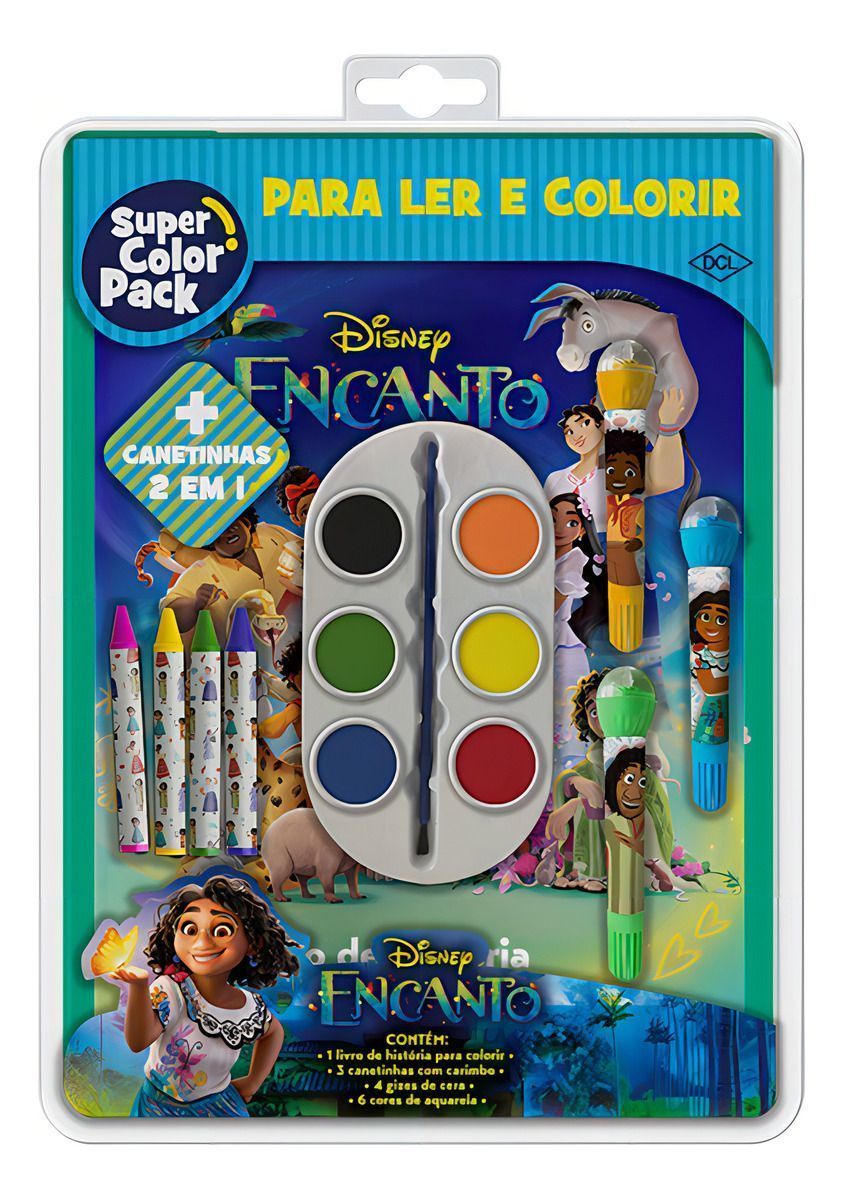 Embarque em uma jornada colorida e educativa com o Super Color Pack Encanto!   Esse kit oferece às crianças a oportunidade de mergulhar no mundo encantador enquanto exploram sua criatividade e habilidades de leitura.  Nesse kit especial, as crianças encontrarão um livro, repleto de ilustrações para ler e colorir, convidando-as a se perder nas aventuras dos personagens mais amados. Além disso, traz gizes de cera, uma paleta de aquarela e canetinhas coloridas com carimbos acoplados, permitindo que as crianças adicionem um toque pessoal às suas criações.   Ao colorir e ler, os pequenos não apenas desenvolvem suas habilidades motoras e criativas, mas também aprimoram suas habilidades de leitura e compreensão, proporcionando uma aprendizagem envolvente e divertida.  O Super Color Pack é mais do que apenas um kit de atividades, ele é uma porta de entrada para um mundo mágico onde a educação se entrelaça com a diversão, proporcionando às crianças momentos inesquecíveis de criatividade, descoberta e, é claro, muita cor!