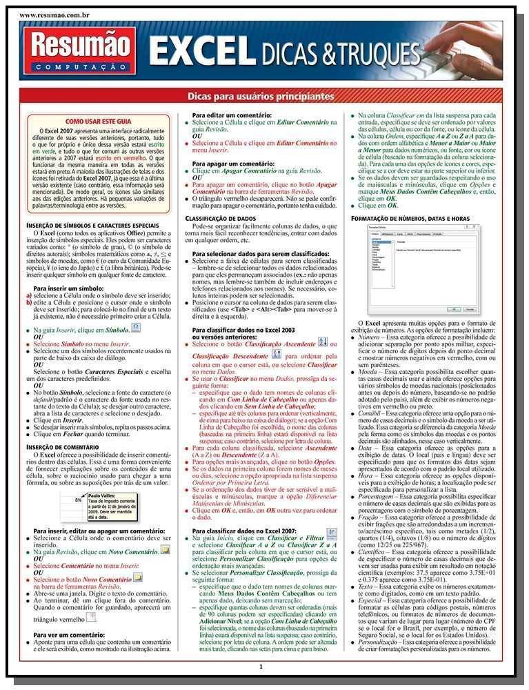 Um passo-a-passo para usar, entender e aproveitar melhor um dos aplicativos mais populares da Microsoft. Dicas para usuários principiantes que vão desde como inserir um símbolo, um comentário, a classificação de dados e formatação de números, datas e horas, além de adição de cabeçalhos e rodapés. O Resumão ainda traz dicas para usuários intermediários e avançados, além das dicas para fórmulas e uso de tabelas de pesquisa.