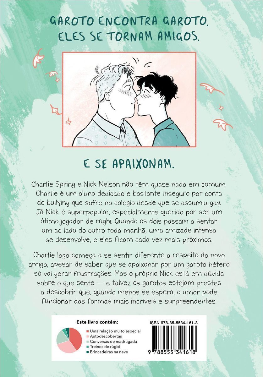 O primeiro volume da adorada série em quadrinhos finalmente chega ao Brasil. Charlie Spring e Nick Nelson não têm quase nada em comum. Charlie é um aluno dedicado e bastante inseguro por conta do bullying que sofre no colégio desde que se assumiu gay. Já Nick é superpopular, especialmente querido por ser um ótimo jogador de rúgbi. Quando os dois passam a sentar um ao lado do outro toda manhã, uma amizade intensa se desenvolve, e eles ficam cada vez mais próximos. Charlie logo começa a se sentir diferente a respeito do novo amigo, apesar de saber que se apaixonar por um garoto hétero só vai gerar frustrações. Mas o próprio Nick está em dúvida sobre o que sente — e talvez os garotos estejam prestes a descobrir que, quando menos se espera, o amor pode funcionar das formas mais incríveis e surpreendentes. Essa edição contém: Capa dura Ilustrações em duas cores Fichas sobre cada personagem Uma prévia do próximo volume Em breve Heartstopper vai se tornar uma série da Netflix!