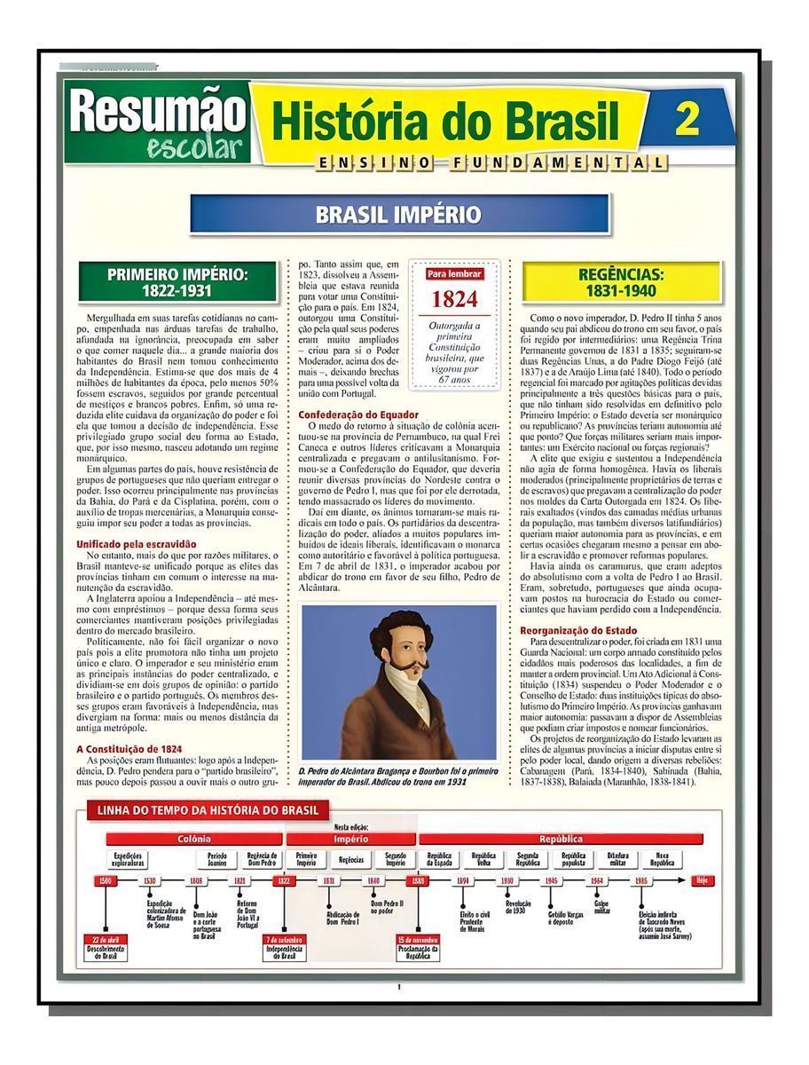 Este guia aborda os principais acontecimentos do período imperial brasileira até a proclamação da República. A Constituição de 1824, a Confederação do Equador, as Regências, a Guerra dos Farrapos, a instalação do segundo império e a maioridade de Pedro II, o sistema político vigente, o café e outras atividades econômicas (açúcar, algodão e borracha), o barão de Mauá, a imigração, a sociedade imperial (o poder dos latifundiários e a burguesia do café), o sincretismo religioso, a política externa e a Guerra do Paraguai, o movimento republicano, a crise do segundo império e o fim da escravidão. E mais: o atrito com os militares, a festa da ilha Fiscal e a proclamação da República.