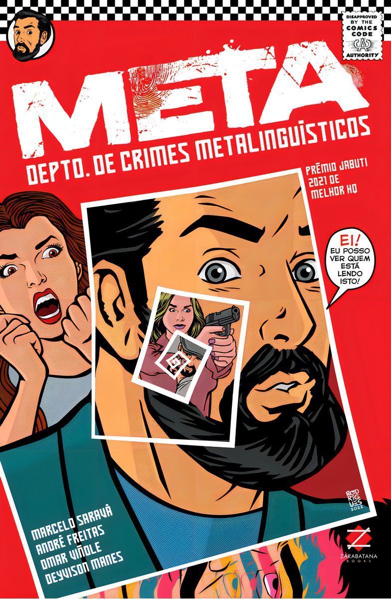 (...) Em META - Depto. de Crimes Metalinguísticos, Saravá, que também é autor de Aos Cuidados de Rafaela, parte do assassinato de um desenhista, cujos principais suspeitos são os personagens criados por ele para uma HQ. Nesse contexto entra em cena META, uma polícia secreta que investiga casos ocorridos em universos diferentes, com detetives que atuam nos quadrinhos, teatro, literatura, cinema e quaisquer outras mídias narrativas e quebram a quarta parede para sair desses universos e solucionar os mais estranhos casos. Em um exercício estilístico de narrar histórias sobre o ato de contar histórias, o roteiro de Saravá reúne drama, humor, experimentalismo e cultura pop, colocando em discussão a relação das pessoas com as artes. Dentro dessa ideia, META conta com a participação especial de personagens conhecidos, como Bone, do autor norte-americano Jeff Smith, e Deus, do cartunista brasileiro Carlos Ruas. Ao todo, a HQ contém 19 artes de quadrinistas brasileiros e internacionais, como Walt Simonson e Laerte Coutinho, além de incluir homenagens póstumas a Juan Giménez e Daniel Azulay, falecidos em 2020. Outra peculiaridade da publicação é o elenco definido pelo desenhista André Freitas, que criou as artes dos personagens a partir de fotos. O protagonista, Alan Mancuso, por exemplo, é baseado no visual de Saravá. O próprio Freitas empresta seu rosto para três personagens diferentes.