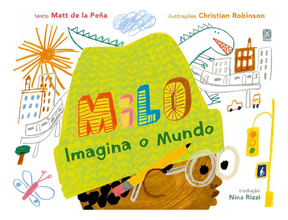 Domingo, Milo e sua irmã entram no trem. Empolgação empilhada por cima de preocupação, por cima de ansiedade, por cima de muito amor. Para não explodir, ele vai desenhando as pessoas e suas vidas... imaginando o mundo: o homem barbudo fazendo cruzadinhas, a mulher vestida de noiva e seu cachorro. Como são as suas vidas, tristes ou felizes? E aquele garoto de terno de cabelo arrumadinho? Para onde será que vai esse menino? Borboletas brincam no estômago de Milo quando chega a sua parada. Para onde estão indo ele e sua irmã? Uma história de distanciamento e de encontro, nos abraços de família — o lugar mais acolhedor da imaginação.