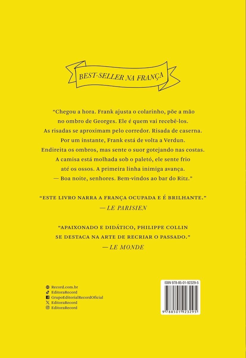 Quando o Ritz se torna o local favorito dos nazistas, um barman judeu não tem escolha senão continuar trabalhando. O que ninguém sabe é que, além de fazer coquetéis, ele também ajuda famílias judias a fugir. Baseado em uma história real e best-seller na França, O barman do Ritz de Paris, de Philippe Collin, é o grande romance sobre a Ocupação alemã. Paris, 1940. Apesar da Ocupação nazista, o ilustre hotel Ritz consegue permanecer aberto. O bar do hotel logo passa a ser frequentado pela alta patente militar alemã, que busca experimentar ali o famoso refinamento francês. Frank Meier, o barman mais célebre do Ritz, precisa então se adaptar à nova clientela e manter em segredo algo que ninguém jamais pode descobrir: ele é judeu. Frank se sente mais sufocado a cada palavra e sorriso que oferece. Ainda assim, o barman de origem austríaca, que lutou pela França na Primeira Guerra, se recusa a fugir. Frank ouve e age discretamente, fornecendo documentos falsos a outros judeus e contribuindo — inclusive de forma involuntária — para atividades conspiratórias. Afinal, quem desconfiaria de um barman? Traições, mentiras e incertezas tornam a posição de Frank mais arriscada, mas ele está sempre um passo à frente do destino. Com uma narrativa fascinante, O barman do Ritz de Paris traz uma perspectiva inusitada da Ocupação nazista na França, expondo os privilégios da alta sociedade francesa, além de nos colocar o dilema de Frank Meier: qual seria a dose perfeita entre a resignação, que o mantém vivo, e a coragem, que lhe dá motivo para viver? “Com seu indiscutível talento de contar histórias, Philippe Collin nos faz embarcar no cotidiano de um teatro de máscaras.” – Le Figaro “Este livro narra a França ocupada e é brilhante.” - Le Parisien “Apaixonado e didático, Philippe Collin se destaca na arte de recriar o passado.” — Le Monde “A incrível história de um barman judeu do Ritz que servia clientes nazistas.” - Le Parisien “Ao misturar na coqueteleira seu conhecimento do período e seu gosto pela psicologia, diluídos em uma narrativa habilmente construída, Philippe Collin cria um coquetel embriagante.” — L’Express “Philippe Collin é um contador de histórias magnífico. Este romance fascina a cada reviravolta.” — Elle “Um personagem fascinante…” - La Grande Librairie