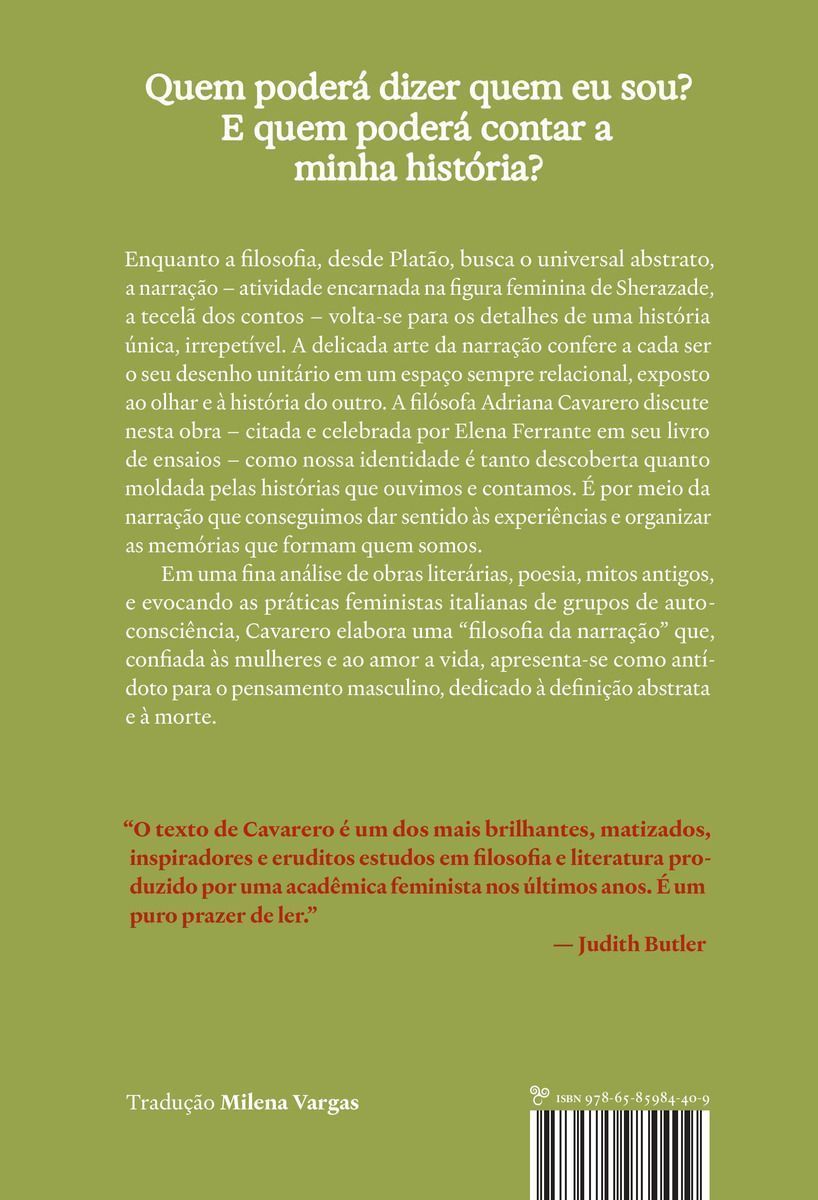 Quem poderá dizer quem eu sou? E quem poderá contar a minha história? Enquanto a filosofia, desde Platão, busca o universal abstrato, a narração — atividade encarnada na figura feminina de Sherazade, a tecelã dos contos — volta-se para os detalhes de uma história única, irrepetível. A delicada arte da narração confere a cada ser o seu desenho unitário em um espaço sempre relacional, exposto ao olhar e à história do outro. A filósofa Adriana Cavarero discute nesta obra, citada e celebrada por Elena Ferrante em seu livro de ensaios, como nossa identidade é tanto descoberta quanto moldada pelas histórias que ouvimos e contamos. É por meio da narração que conseguimos dar sentido às experiências e organizar as memórias que formam quem somos. Em uma fina análise de obras literárias, poesia, mitos antigos e evocando as práticas feministas italianas de grupos de autoconsciência, Cavarero elabora uma “filosofia da narração” que, confiada às mulheres e ao amor a vida, se apresenta como antídoto para o pensamento masculino, dedicado à definição abstrata e à morte. "O texto de Cavararo é um dos mais brilhantes, matizados, inspiradores e eruditos estudos em filosofia e literatura produzido por uma acadêmica feminista nos últimos anos. É um puro prazer de ler." Judith Butler