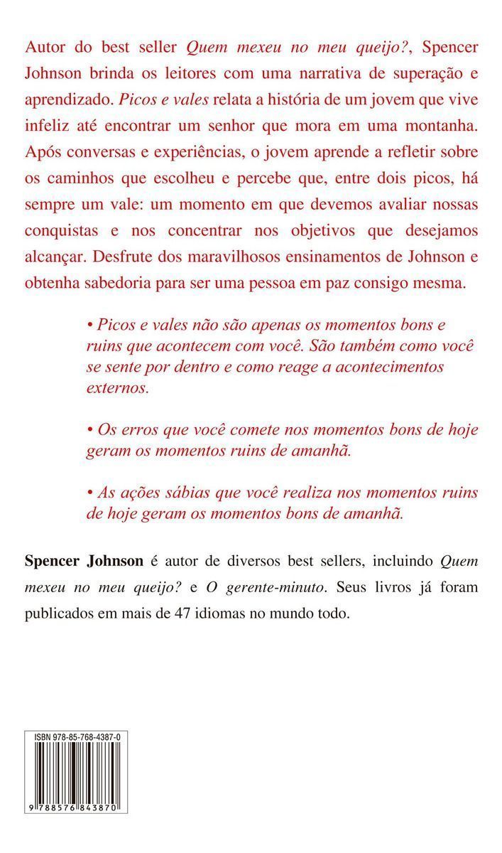 "Autor do best-seller Quem mexeu no meu queijo?, Spencer Johnson presenteia seus leitores com uma narrativa de superação e aprendizado.     Picos e vales relata a história de um jovem que não estava feliz no vale onde morava e todos os dias imaginava como era viver no pico. Quando ele não pôde mais lidar com sua curiosidade, decidiu subir. A jornada para cima, como todas as jornadas da vida, era difícil e demorada, fazendo com que ele ficasse cansado e frustrado por ter perdido o pôr-do-sol.  Enquanto ainda estava reclamando por sua perda, o rapaz encontrou um homem velho, com quem iniciou uma conversa. O senhor perguntou ao jovem o que ele achava da vista. O rapaz estava tão focado no pôr-do-sol que não notou a beleza das estrelas que brilhavam acima dele.  Após conversas e experiências, o jovem aprende a refletir sobre os caminhos que escolheu e percebe que, entre dois picos, há sempre um vale: um momento de avaliação das decisões tomadas e de concentração nos objetivos a serem alcançados.  No dia seguinte, ele agradece ao velho e volta ao vale. Aplicando as lições que aprendeu em sua vida, se transformou para melhor. O jovem aprendeu que, para chegar ao seu auge, é necessário ter uma visão sensata, que faça sentido para você, de forma realista e alcançável.  Picos e vales não são apenas os momentos bons e ruins que acontecem. São também como você se sente por dentro e como reage a acontecimentos externos. Os erros que comete nos momentos bons de hoje geram os momentos ruins de amanhã. As ações sábias que você realiza nos momentos ruins de hoje geram os momentos bons de amanhã.  Picos e vales é um best-seller, com mensagens expressivas, cria respostas assertivas para problemas pessoais ou no local de trabalho. Entenda que o caminho para fora do vale aparece quando você escolhe ver os picos de maneira diferente. "