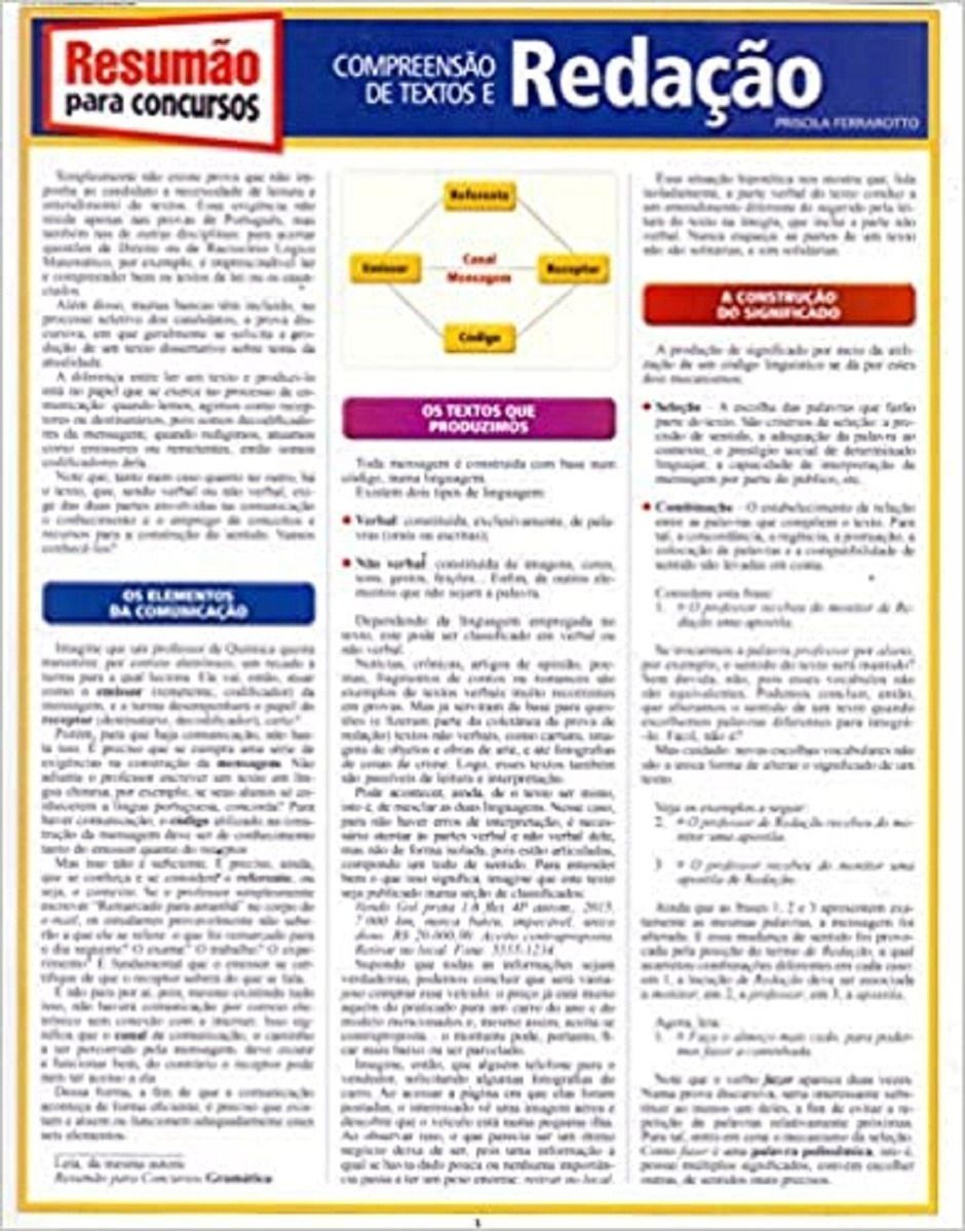 Ainda que o candidato saiba profundamente toda a matéria, seu conhecimento não valerá de nada se ele não entender o enunciado de cada pergunta. Como diz a autora do Resumão, Priscila Ferrarotto, "simplesmente não existe prova que não imponha ao candidato a necessidade de leitura e entendimento de textos" - e essa é uma exigência que se estende a muitas outras disciplinas além do Português. Muitas provas também pedem que o candidato produza um texto dissertativo sobre algum tema atual. O Resumão para Concursos Compreensão de textos e Redação traz todas as dicas para que você possa desenvolver essas habilidades e passar nas provas