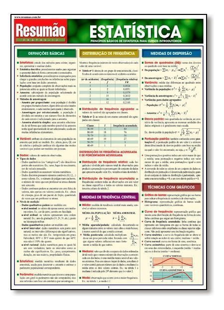 Princípios básicos de estatística para cursos introdutórios - Distribuição da freqüência; Medidas de tendência central; Medidas de dispersão; Técnicas com gráficos; Probabilidade; Variáveis aleatórias; Inferência estatística; Estimação; Desvio padrão da média; Testando hipóteses estatísticas; Teorema do limite central; Inferência sobre a média populacional com uso da estatística-z; Inferência sobre média populacional usando a estatística-t; Intervalo de confiança; Comparação entre médias populacionais; Comparação de variâncias e Regressão.