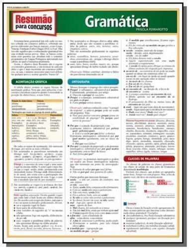 Quais são dentro da Gramatica da Língua Portuguesa, os temas mais recorrentes nos concursos públicos? Quais são as regras de acentuação mais cobradas? Este título trás essas dicas e muitas outras. Entre os conteúdos abordados, são: acentuação, ortografia, classes de palavras, pronomes e verbos; concordância (nominal e verbal) e pontuação. Você vai descobrir, por exemplo, quando o uso da virgula é proibido, quando é facultativo e quando é obrigatório. Com o Resumão, você pode ir direto ao ponto. Não perca.