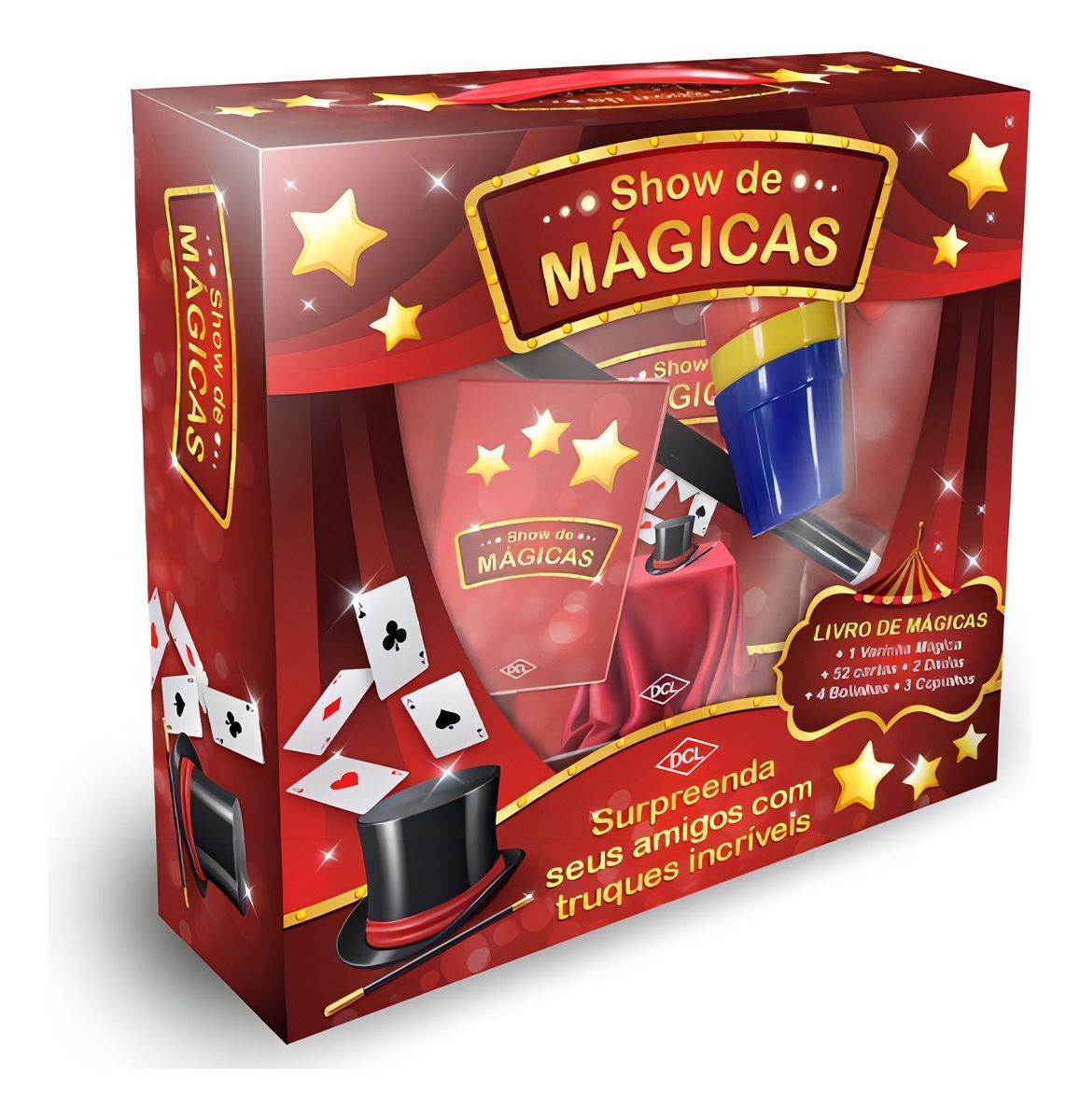 Surpreenda seus amigos com truques incríveis! São vários truques superlegais, com diversos instrumentos e dicas bacanas para você melhorar sua performance! Contém: 1 varinha mágica, 1 baralho com 52 cartas, 2 dados, 3 copinhos, 4 bolinhas e 1 livro de mágicas.