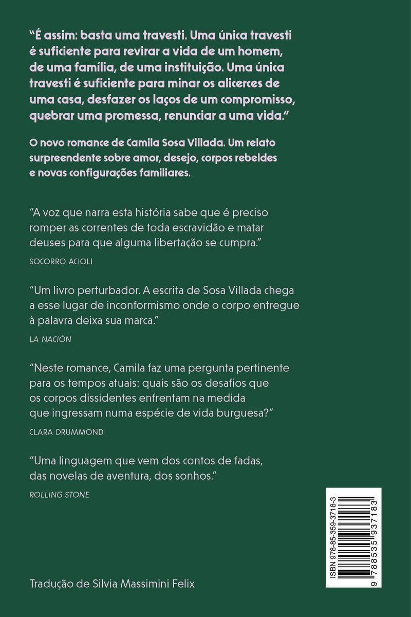 A estreia da autora de Parque das irmãs magníficas na Companhia das Letras. Um romance sobre amor, desejo, corpos rebeldes e novas configurações familiares. Uma atriz trans adota um menino de seis anos com seu marido, um advogado gay. O garoto traz consigo uma história trágica: soropositivo, não conheceu seu pai biológico, e sua mãe se suicidou quando descobriu que o contagiou com o vírus HIV. A partir deste enredo, a prosa inclassificável de Camila Sosa Villada nos conduz por uma espécie de sociologia da família, uma indagação comovente sobre os papéis que a compõem, sobretudo no que diz respeito às possibilidades do amor. Até que ponto é possível domesticar um corpo? Como conviver com as feridas do outro? O que fazer quando se cai nas garras das convenções, do socialmente respeitável? A literatura de Camila Sosa Villada — “a coisa mais importante que li sobre sexualidade desde Jean Genet”, anotou o autor francês Édouard Louis — desafia de modo cabal nossas emoções. Nesta história de pactos invisíveis, de uma rebeldia profunda e convulsiva, de paixões arrasadoras, ninguém sai como entrou. “Há na voz de Camila Sosa Villada uma espécie de pano ou lenço de seda a tremular por paisagens assombrosas, e nós somos o bicho, somos o olho e estamos na voz do que ela narrar. A voz preciosa. Rara. A mesma que silencia e logo depois acende tudo ao redor.” — Aline Bei “Um livro perturbador. A escrita de Sosa Villada chega a esse lugar de inconformismo onde o corpo entregue à palavra deixa sua marca.” — La Nación “A voz que narra esta história sabe que é preciso romper as correntes de toda escravidão e matar deuses para que alguma libertação se cumpra. A voz de Camila, cada vez mais, se estabelece como uma das mais hábeis e sofisticadas da nossa narrativa contemporânea.” — Socorro Acioli