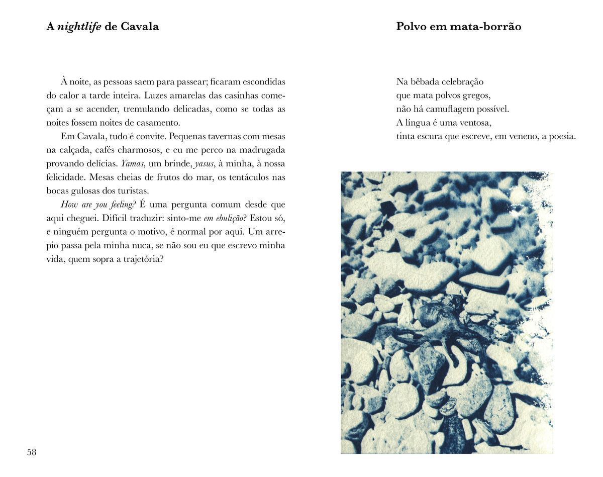 Um Quarto em Cavala é, antes de tudo, uma reflexão sobre o paradoxo da existência. Vita, conduzida por uma força que mal compreende, atravessa fronteiras para confrontar o vazio. Sua viagem não é apenas um deslocamento físico; é uma renúncia à segurança de uma vida definida por limites invisíveis, uma busca pela sua essência. O quarto em Cavala não é refúgio nem prisão, mas um lugar suspenso, onde o passado e o presente se entrelaçam, fazendo surgir a experiência poética. A viagem de Vita, mais do que física, é uma jornada filosófica e criativa. O espaço exterior — Cavala, com suas paisagens e mitos — espelha o mergulho interior em um mar simbólico de memórias, medos e possibilidades. E também o encontro com outras linguagens. A narrativa propõe uma reflexão profunda sobre os caminhos que se bifurcam entre a solidão e o pertencimento, entre a voz interna e os ecos de mulheres artistas e mitológicas que, ao longo do tempo, deixaram suas marcas. Vita, ao se encontrar com essas vozes, descobre que sua travessia não é apenas uma fuga, mas um rito de iniciação. A escrita é seu território de ancoragem e também o vento que a leva, num constante movimento entre perder-se e recriar-se. Em Um Quarto em Cavala, a viagem é apresentada como uma condição inevitável da existência humana, na qual a verdadeira liberdade só é alcançada ao aceitar-se como parte do mistério.